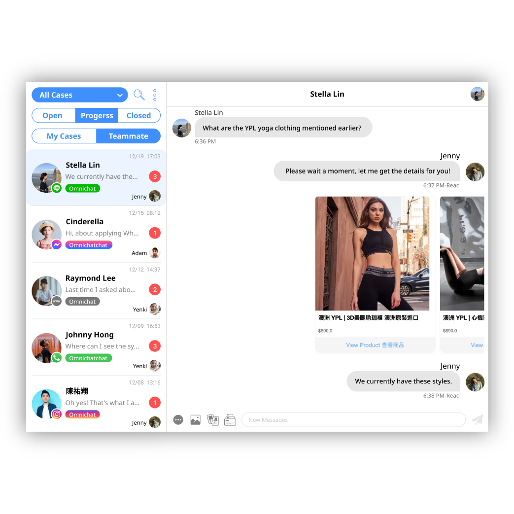 Engage with customers anywhere, anytime by managing their conversations from your website, messaging channels like Facebook Messenger, LINE, WhatsApp for better communications and more sales.